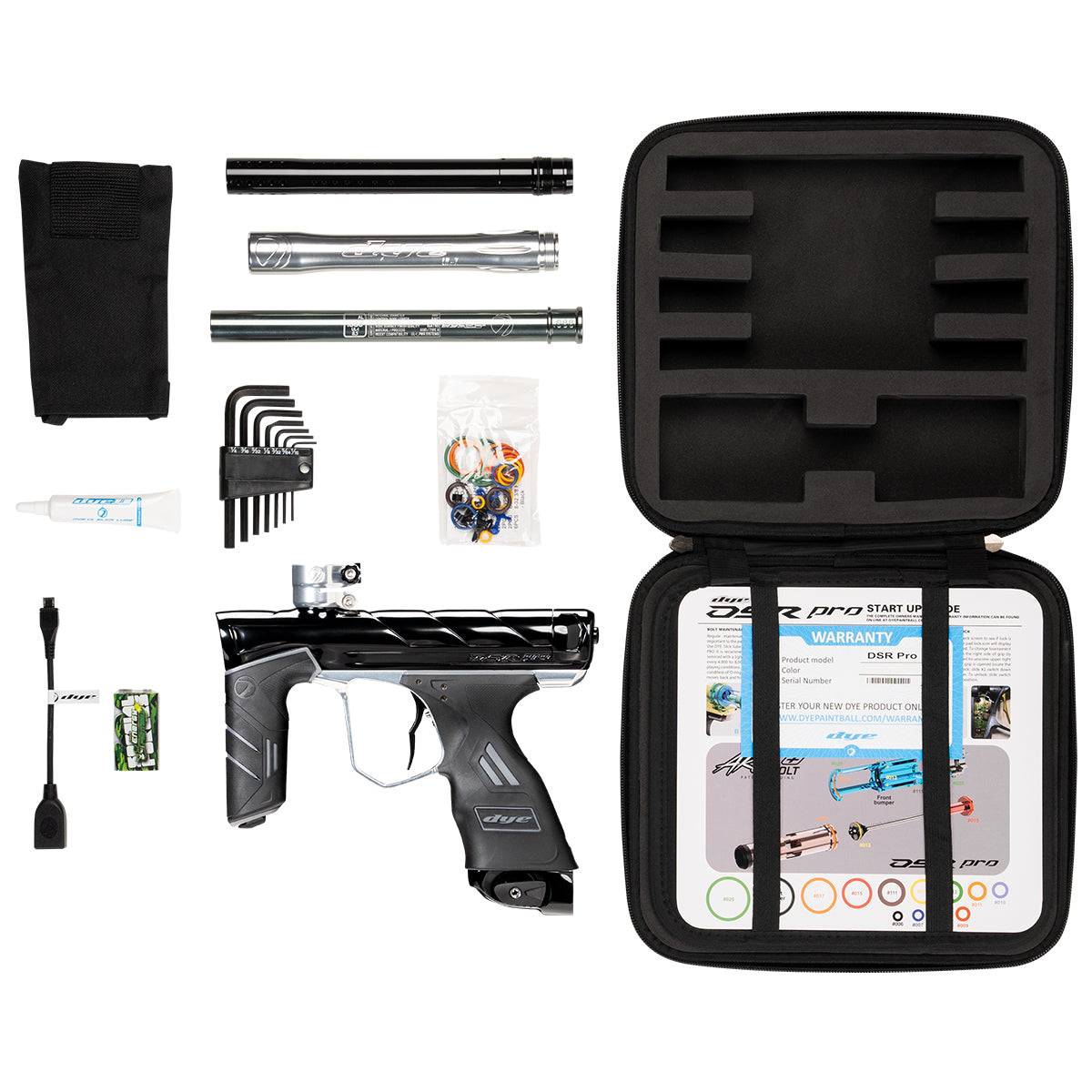 Features an EVA foam lining for secure protection of the DSR Pro. DYE Slick Lube Advanced, DSR Pro parts kit, quick-start guide, DYE Core Allen key set, 9-bolt battery, barrel sock and .688 UL-i aluminum insert are included with marker.