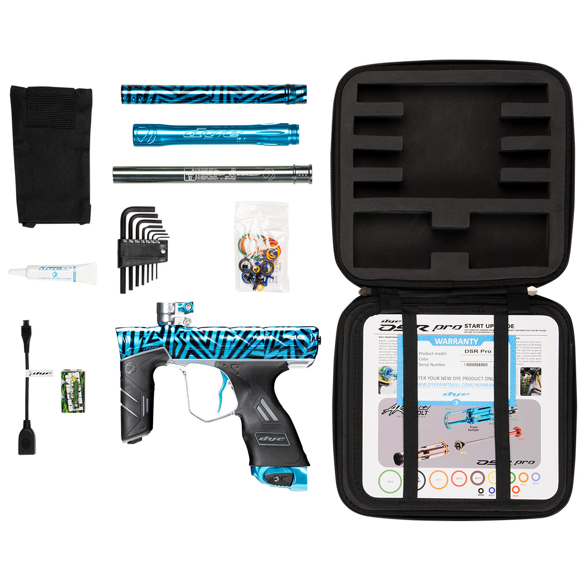 Features an EVA foam lining for secure protection of the DSR Pro. DYE Slick Lube Advanced, DSR Pro parts kit, quick-start guide, DYE Core Allen key set, 9-bolt battery, barrel sock and .688 UL-i aluminum insert are included with marker.